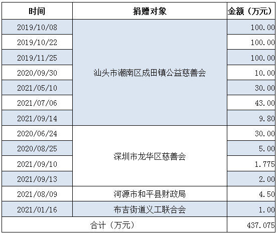 自2019年以來,廣東燦城集團在董事長李陽城的帶領下積極踐行企業社會責任,參與社會各類公益捐贈總額超過437萬元。其中向汕頭市潮南區成田鎮公益慈善會捐贈資金392.80萬元;向深圳市龍華區慈善會捐贈38.775萬元;向河源市和平縣財政局捐贈4.5萬元,幫助貧困學子成長成才;向布吉街道義工聯合會捐贈1萬元等等。